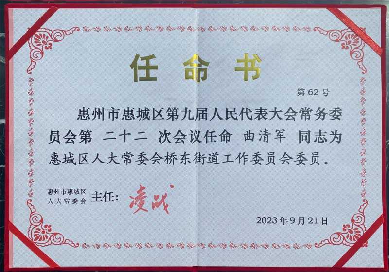 • 曲清軍獲任惠城區人大常委會橋東街道工...